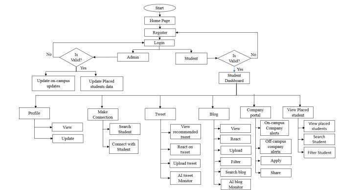 For Students:Studentsareledtoapersonalizeddashboard offeringanarrayoffeatures,includingprofilemanagement, peerconnections,tweetrecommendations,companyportal access, and alerts regarding on-campus activities and placements.Additionally,studentscaninteractwithtweets, uploadcontent,applyforopportunities,andmonitoralerts relevanttotheiracademicandprofessionaljourney.