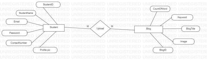 The relationship between students and blogs is characterized by a many-to-many association. This means that multiple students can contribute to and interact with multipleblogs,andviceversa.Studentshavethefreedomto share their insights, experiences, and learning resources throughblogposts,whilealsobeingabletoengagewithand comment on posts created by their peers. Similarly, blogs serveasaplatformforfacilitatingcollaborativelearningand knowledgesharingamongstudentsacrossvariousacademic