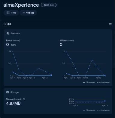 Firebase provides valuable insights into user traffic analysis and storage usage for projects, as demonstrated intheAlmaXperienceappscreenshot.Usertrafficanalysis reveals usage patterns, popular features, and user engagementlevels.Forinstance,onApril12th,therewere 1.1Kreadsand11writestoFirestore,indicatinghighuser interaction with the app's content. Storage usage information helps in optimizing storage allocation and identifying areas for efficiency. Currently, the AlmaXperienceapputilizes 4.91MBofstorage,reflecting effective management. Additionally, Firebase analytics aids in bug detection, tracking marketing campaign performance, and assessing global app usage. Overall, Firebase empowers app developers to enhance user experience, optimize performance, and make informed decisions.