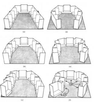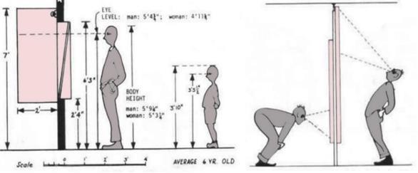 Themajorityofthetime,humanscanperceiveandidentify objects inside a roughly elliptical cone of vision, with the cone'stipateyelevel,andminimaleyemovement.Thespace willseembettertovisitors,andtheywillbeabletofollowthe displaywithease.Staggeredsetupsarefrequentlypossible. This gives the place a certain air of mystery and makes visitors want to look around corners to find out what's aroundthenextbend.