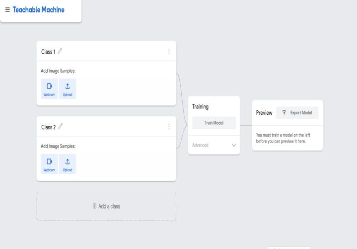 Teachable Machine is an online tool designed for individuals to train their own machine learning classificationmodelswithoutanycodingknowledge.Users canutilizetheirwebcam,images,orsoundtotrainmodels. It employs transfer learning, a machine learning technique, to identify patterns and trends within the provided data and swiftly generate a classification model. Through transfer learning, users can incorporate their own data andrefinea model basedona pre-existing base model that has been trained on a vast dataset within a specific domain.For instance,the base model (mobilenet) used for image recognition in Teachable Machine was initially trained to recognize 1000 classes (such as dogs, phones, beds, trombones, etc.). The inherent features utilized by mobilenet to recognize these classes can also beappliedtoidentifynewclassesdefinedbytheuser.This