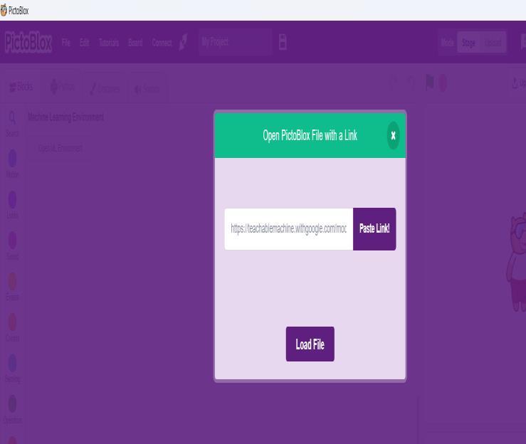 Paste the copied link into the Pictoblox Software and click "Load File." The respective machine learningcodeswillthenbegenerated.