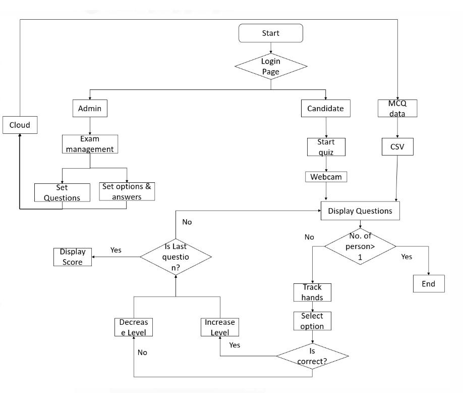 Next the system tracks the hand and detects the palm of the candidate through a webcam so that it can understand the gesture shown by the candidate. This detection and Tracking are done with the help of a hand tracking class in CVZONE library. This CVZONE library uses Media Pipe Algorithm which is created by google for tracking hands and detecting the palm. This Media pipe willdetect21handlandmarksinthepalmwhichmakethe system get better understanding about the gestures shown. Answering the questions is based on clicking the option button. The system identifies the clicked button using the distance between the index finger and Middle fingerifthedistanceislessthanthebuttoninfrontofthe hand is considered as clicked. For the exit button it considers the distance between ring and thumb fingers. The distance between the fingers is calculated by the CVZONE library as it identifies the hand landmarks accordingtothatthetipofindexfingerandmiddle finger is given with landmark numbers as 8 and 12 respectively by the media pipe algorithm. Then the distance between these points is calculated if the distance is less than 60 then it considers the option is clicked. Similarly, the distance between the tip of the ring and thumb finger is calculatedusingtheirlandmarksmentionedinmediapipe.