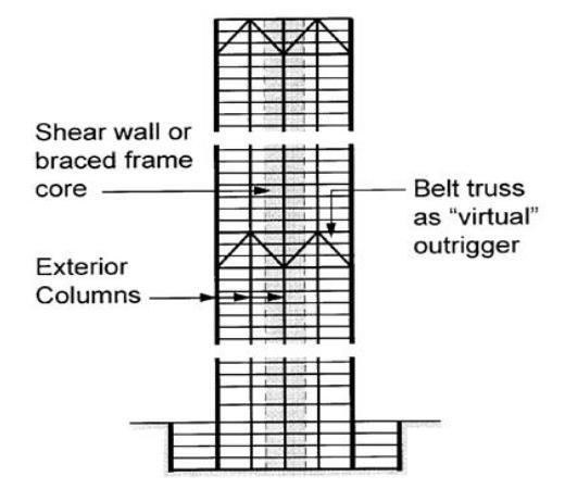 Asdiscussed,Belttrussesareoftenprovidedtodistribute thistension-compressiononexteriorcolumnsthatprovide strengthformostoftheexteriorframingcolumns.So,inthis concept, the structure that connects the core and the perimetersystemiseliminatedimmediatelyandreplacedby a belt truss with a combination of a rigid and strong diaphragm.Themomentproducedinthecoreisconverted intoahorizontalcoupleintopandbottombasementfloors.