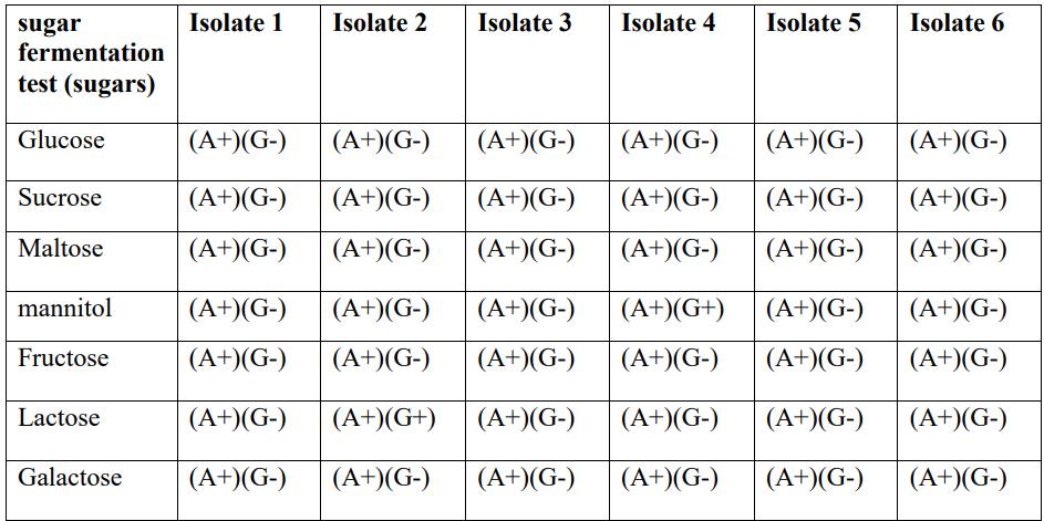 citrate, catalase, oxidase, arginine hydrolysis, and CO2 generation were all shown to have negative findings in biochemical testing. Tests on the fermentation of carbohydratesrevealedheterofermentativetraits,whichmay haveledtothestrains'identificationasLactobacillussp.