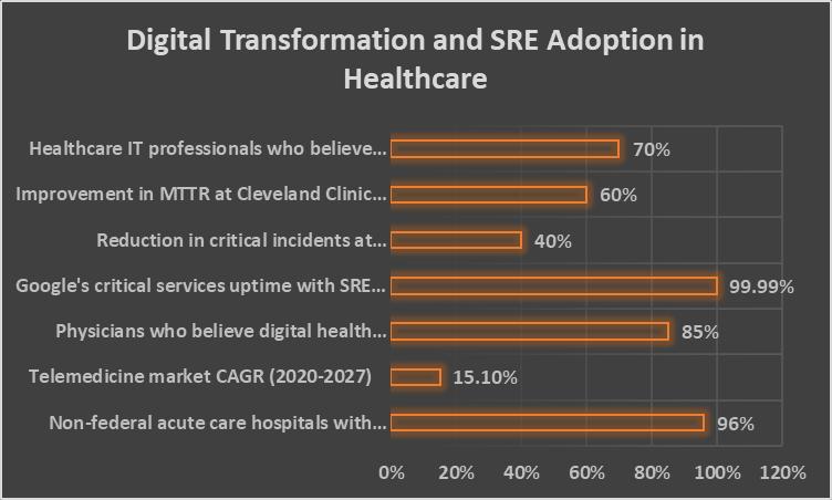 To address these issues, healthcare systems can use the principles and practices of Site Reliability Engineering (SRE), a discipline that Google pioneered. SRE focuses on building and operating large-scale, highly reliable systems through a combinationofsoftwareengineeringandoperationspractices[5].Google'sSREteamhasreportedthatbyimplementingSRE practices, they have been able to maintain an uptime of 99.99% for their critical services [6]. A case study by the Cleveland ClinicdemonstratedthatbyapplyingSREprinciplestotheirIToperations,theywereabletoreducecriticalincidentsby40% and improve the mean time to resolve (MTTR) by 60% [7]. By adopting SRE principles, healthcare organizations can ensure thesmoothfunctioningoftheirdigitalinfrastructure,ultimatelyleadingtoimprovedpatientcareandoperationalefficiency.A survey by the Healthcare Information and Management Systems Society (HIMSS) found that 70% of healthcare IT professionalsbelievethatimplementingSREpracticescansignificantlyenhancethereliabilityandperformanceofhealthcare systems[8].