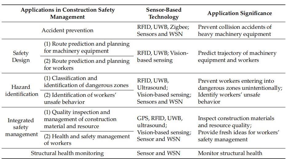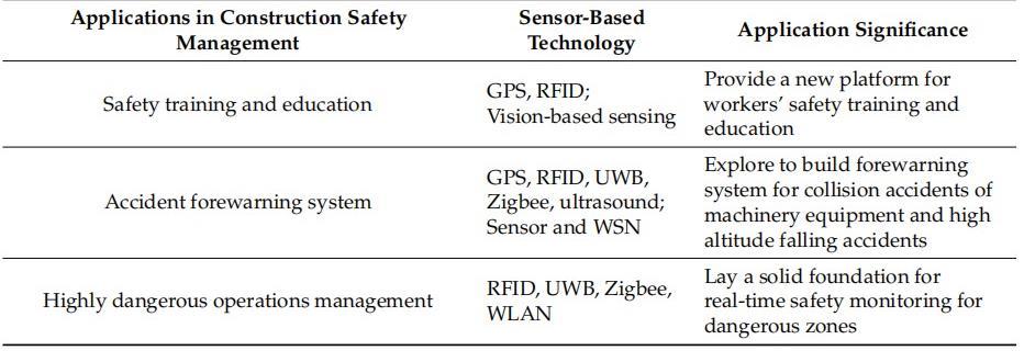 Itmakesthereal-timeconstructionsafetymanagementwith high efficiency and accuracy a reality and provides a solid foundation for facilitating its modernization, and informatization Nowadays, various sensor-based technologies have been adopted for construction safety management, including locating sensor-based technology, vision-basedsensingandwirelesssensornetworks.