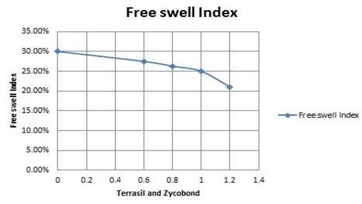 T.Raghavendra etal. (2018)conductedastudythataimedto addresstheexpansivenessandcrackingissuesinblackcotton soil, which contain montmorillonite clay mineral, by stabilizingitwithnanochemicals.TheSoilsamplecollected wasBlackcottonsoilnearRGMCollege,Nandyal.Thetests conducted were Specific gravity, liquid limit, plastic limit, sieve analysis, hydrometer analysis, compaction test, unconfinedcompressivestrengthtest,directsheartest,CBR test, and free swell index test. The study used stabilizing agents like Cement (3% of soil amount), Terrasil, and Zycobondatdifferentproportions(0.6kg/m3,0.8kg/m3,1 kg/m3,1.2kg/m3).Fig1showsVariationofFreeSwellIndex onAdditionofChemicals(TerrasilandZycobond)
