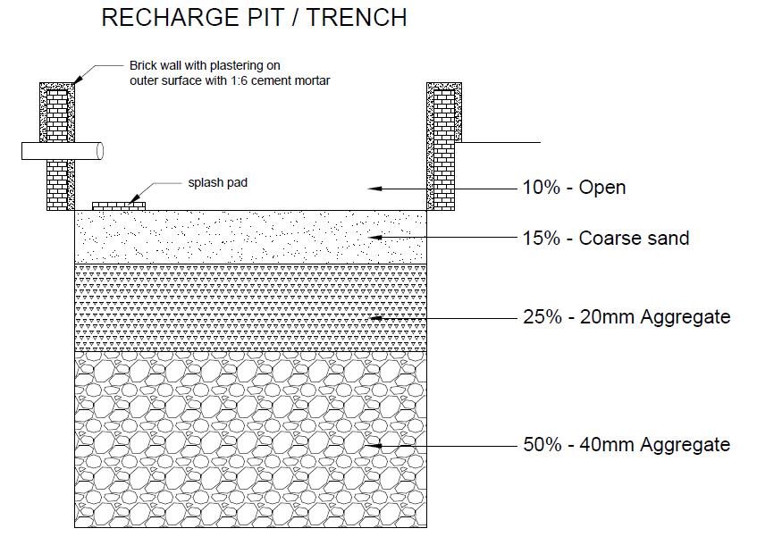Rechargepitsareman-madestructuresstrategicallylocatedinareaswithfavorablesoilpermeabilitytopromoteefficient waterseepageintotheground.Thesepitsserveasessentialcomponentsofsustainablewatermanagementpractices,enabling the gradual infiltration of collected water into the aquifer to replenish the groundwater table. By supporting natural groundwaterrechargeprocesses,rechargepitscontributesignificantlytowaterconservationefforts,watertablestability,and mitigationofdroughtimpacts.