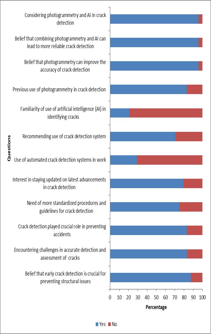 Among construction professionals, only 10% have formal certificationsforinspectingcracks,butover85%stressthe importance of early crack detection and the difficulty of findingcracksthatcausewaterleaks.Mostsupporthaving standardized procedures and 80% are interested in automatedsystems.Thesurveyhighlightstheneedforcosteffective, easy-to-use methods and better knowledge for earlycrackdetectionandmonitoring.