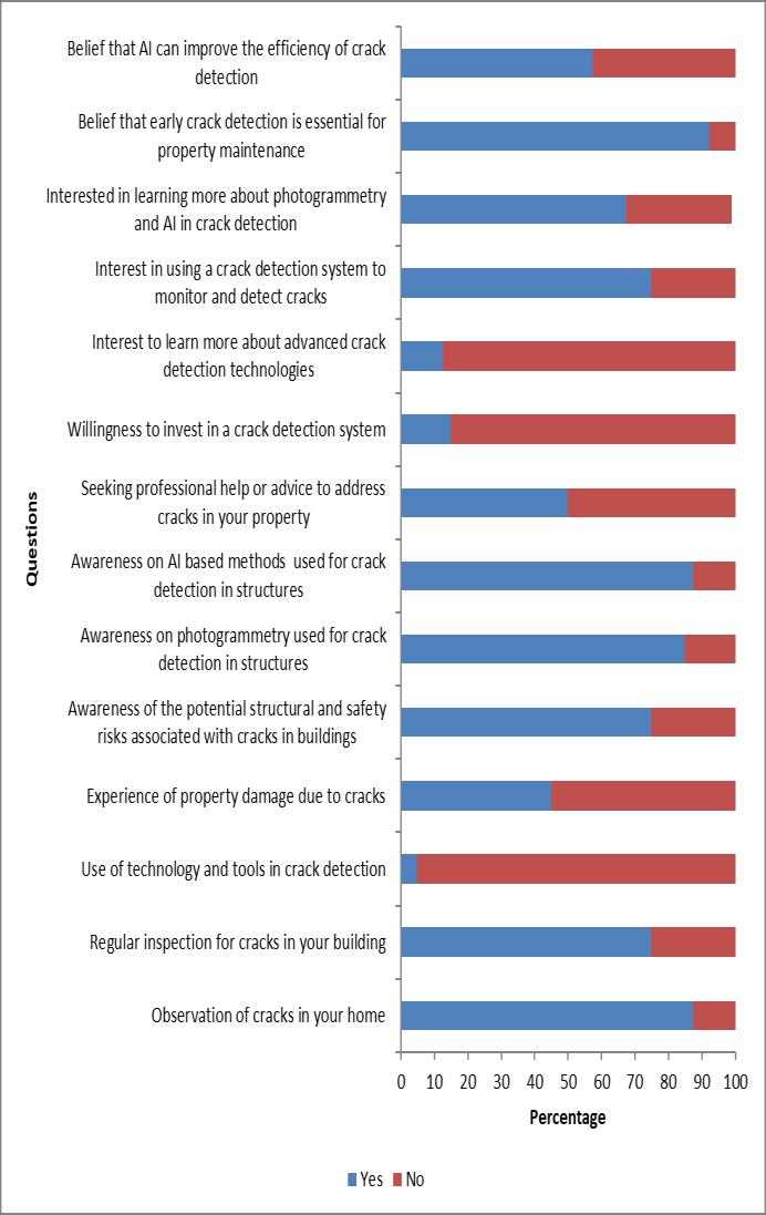 Thefirstsetofquestionersisforapartmentowners,which hasresponseslike30percentofrespondentsareunawareof the potential structural and safety risks associated with cracksinbuildings,85percentageofrespondentsareready toacceptnewtechnologiesandtechniqueswhichhelpsin earlycrackdetectioninordertopreventthefuturedamages. Also, respondents suggested on giving awareness to all potentialapartmentbuyersforperiodicalmaintenanceand checking on the structural stability, rather than the visual inspection incorporating any new methods for solid evidenceofthecrackoccurredwillhelpinfastrectification. Mostimportantlyrespondentssuggestedahandoutwithrisk andremediesduetocrickwouldbeofmoreuse.
