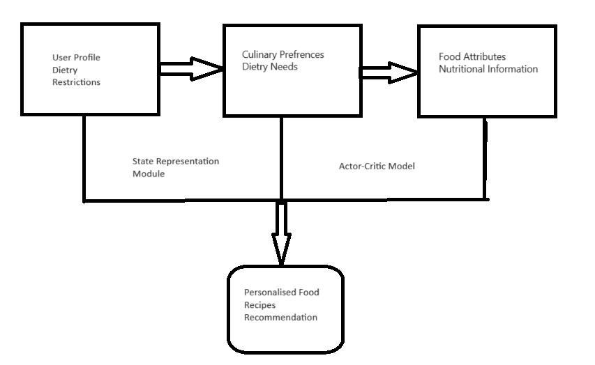 Inourresearchmethodology,weproposetheusage of the actor-critic technique within the Deep Reinforcement Learning (DRL) algorithm [18] which plays a very crucial role. This approach combines both policy-based and value-based strategies,whichhasthepotentialtoimprovethe wholerecommendationprocesssubstantially.The beauty lies here in the incorporation of the Deep Deterministic Policy Gradient (DDPG) method supports ongoing and constantly changing interactionsbetweenusersandfoodrecipes.This