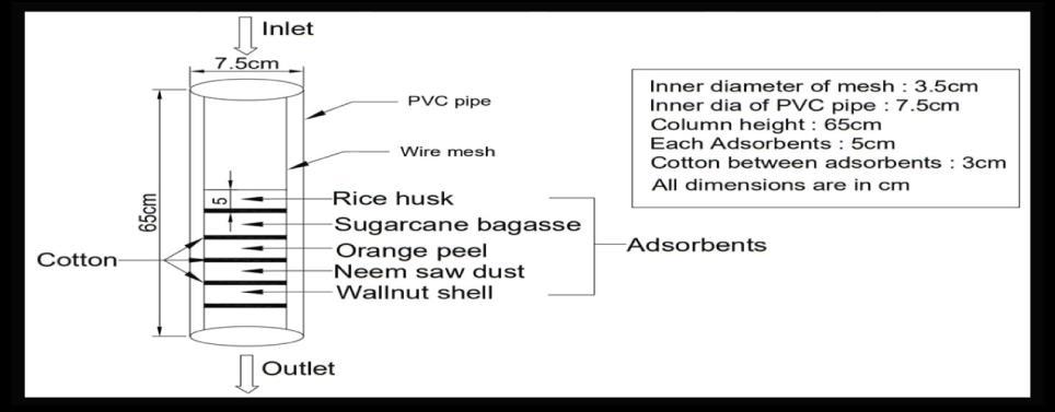 This membrane consists of PVC pipe, wire mesh, one inlet and one outlet. The diameter of wire mesh is 3.75cm and diameterofPVCpipeis7.5cmandthelengthofthepipeis 65cm.Theadsorbentsof5cmeachareplacedlayerbylayerin the wire mesh from bottom and each layer is divided by a 3cmlayerofcotton.