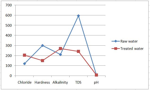 From these results we can understand that the Chloride efficiency is 70%, Hardness efficiency is 50%, Alkalinity efficiencyis28.57%,TDSefficiencyis57.81%,pHefficiencyis 2.27%.Chloride, Hardness,Alkalinityand pHareall in the acceptable limit as per IS Standards. But TDS not in the acceptablelimit.