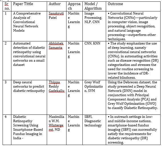 Nikita Kashyap [5] - Mobile Phone Based Diabetic Retinopathy Detection System Using ANN-DWT - Fluid passagefrombloodvesselstotheretinacancausediabetic retinopathy (DR), a common retinal condition.The best treatmentforDRisearlydetectionandeyeexams.awayto slowthespreadofthisillness.Withtheuseofartificialneural network (ANN) algorithms, we describe in this research a low-cost,portablemobilephone-basedresultfindingmethod fortheearlyidentificationofdiabeticretinopathy.Inorderto makeadecision,themobiledevicewilluseacondensinglens to capture retinal images and then an ANN detection algorithm.ThefirstscreeningforDR.Anexistingdatabaseof retinasisexaminedtogaugetheamountofworkcompleted. Ourgoalistodesignanaffordable,efficienttestingmethod thatcanbeusedbyeveryone,eveninlessdevelopedareas.