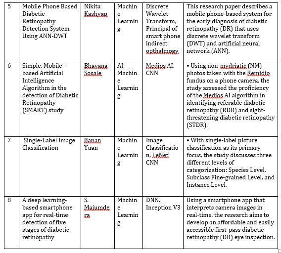 Bhavana Sosale [6] - Simple, Mobile-based Artificial Intelligence Algorithm in the detection of Diabetic Retinopathy(SMART)study-Highsensitivityforreferable andsight-threateningdiabeticretinopathyisdemonstrated by the study's unique AI system, Medios AI, which detects diabetic retinopathy using a smartphone fundus camera whenusedoffline WiththeRemidioNMfundus-on-phone camera and Medios AI, diabetic retinopathy screening is made accessible and scalable in situations with limited resources