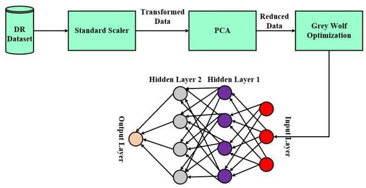 retinopathydatasetisfirstnormalizedusingastandardscaler normalizationmethod.Next,dimensionalityisreducedusing PCA,optimalhyperparameterselectionisdonebyGWO,and thedatasetistrainedutilizingADNN model.Basedonthe performance metrics of accuracy, recall, sensitivity, and specificity,thesuggestedmodelisassessed.Themodelisalso contrasted with the support vector machine (SVM), naive bayesclassifier,decisiontree,andxGBoostclassicalmachine learning algorithms. The findings demonstrate that, in comparison to the previously described algorithms, the suggestedmodelperformsbetter.