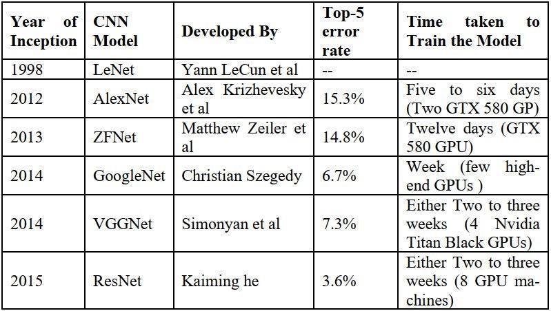 great performance and high adaptability. Deep learning algorithms, also referred to as deep neural networks, are essentially an offspring of artificial neural network architectures with a larger number of hidden layers. Convolutional Neural Networks (CNNs) are a kind of feed forwardnetworkandoneofthemostpopulardeepneural networkmodels.Asynopsisofpopularandwell-respected CNNmodelsisprovidedinthispresentation.Acomparative assessment of these models with various parameter considerationsisalsoincluded.