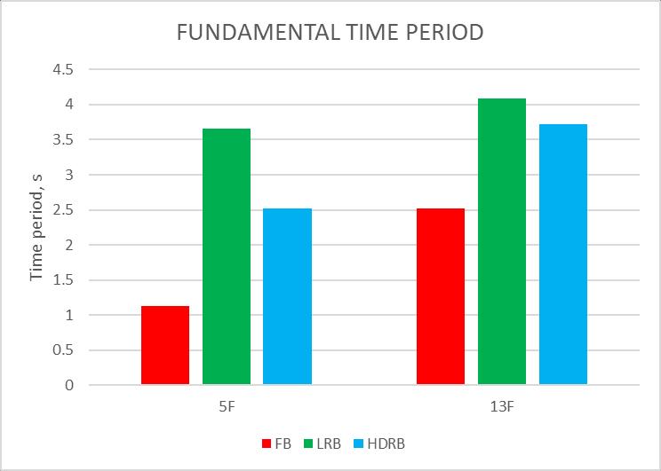 ItcanbeobservedfromFigure4andTable6thatwhen compared with the fixed base buildings of 5 floors the timeperiodincreasesby3.6and2.4timesforLRBand HDRBbuildingsrespectively.For13Floorsbuildingsthis increase is 1.66 and 1.56 times, overall time period increasesduetobaseisolation.