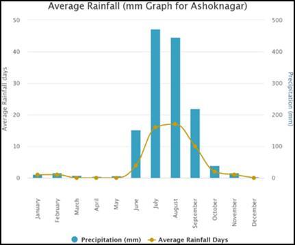 The climate of Ashoknagar district is composite which is characterizedfurtherbyahotsummerandgeneraldryness exceptduringthemonsoonseason.Theannualrainfallofthe districtmeasuresas927.1mm(TheCGWB,MinistryofJal Shakti,Govt.ofIndia).