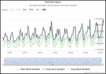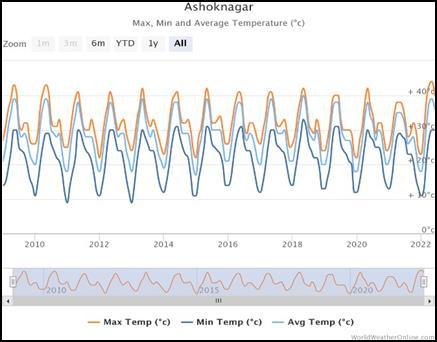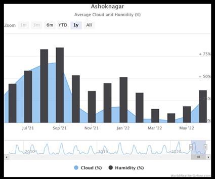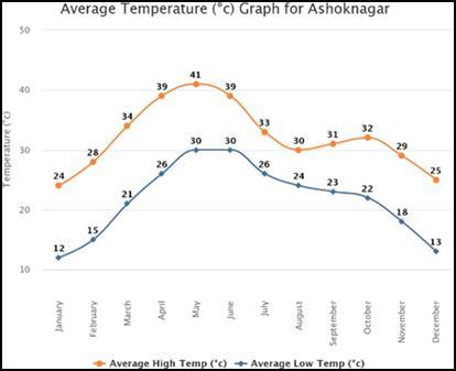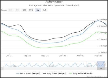 As shown in graph, the typical maximum temperature is found in May, which is 41.3°C, while the minimum temperaturehasisfoundinJanuarymonth,whichis12°C. ThewindrosediagramshowsAshoknagardistrict'saverage annualwindspeedas8.1km/h.