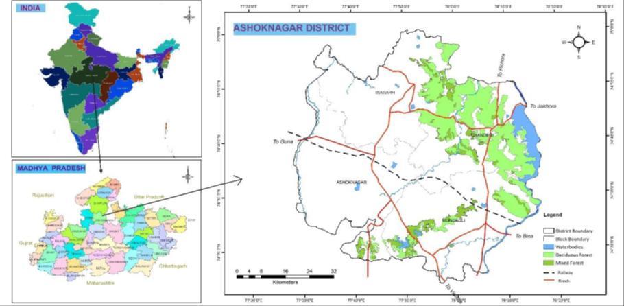 The study is concerned with the Ashoknagar Urban Development Area. Ashoknagar covers an area of about 4,673.94sqkm&situatedinthenortheasternportionofthe Madhya Pradesh. Geographically, the district is situated between the latitude 24.34 N and longitude 77.43 E. and falling in Survey of India toposheet nos 54 G, H & L. It is boundedintheNorthbyShivpuridistrictandeastbyUttar Pradesh, in the south by the Rajgarh & in the west by the Guna district (Census of India, 2011). In the figure 1, the boundariesofAshoknagardistrictaredefinedbytwoofthe rivers,SindhandtheBetwa.