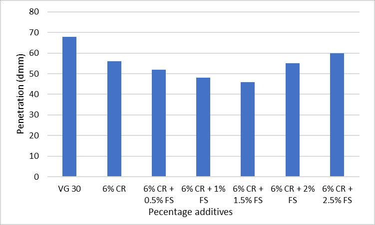 The penetration test was performed for modified and unmodified samples. The addition of 6% crumb rubber reducedthepenetrationvalueby17.64%.Furthermore,the additionoffumedsilicatothesesamplesalsoreducedthe penetration value, with the lowest value obtained for the