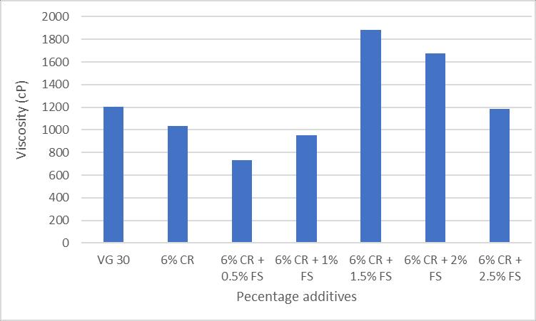 Viscosity describes the fluid properties of bituminous materials. Bituminous material spreads, penetrates voids, and coats aggregates based on its fluidity at a given temperature. The addition of crumb rubber, along with fumedsilica,enhancesviscosity.Themaximumviscosityis obtainedforthesamplewith1.5%FS,whichis56%greater thantheneatbindereventhoughalowpercentageoffumed silica results in lower viscosity. It was found that adding crumb rubber and fumed silica improves the binder's consistency and enhances its durability at high temperatures.