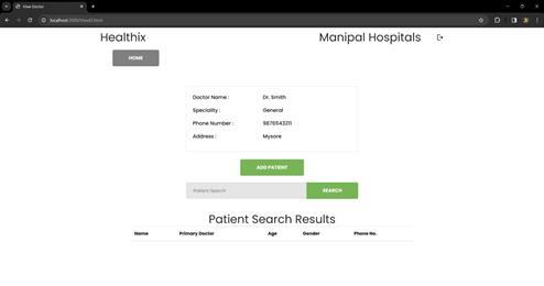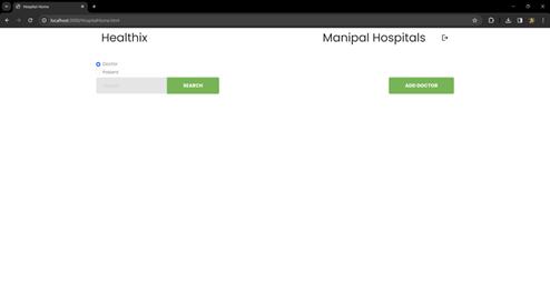 Fig.3.isthemainpagethattheHospitalUserwillenterwhen theirloginissuccessfulandtheircredentialsarevalid.The Login displays the name of the hospital in the top right corner. This page also can search for either Doctors or Patients that are pertaining to that hospital only. We have alsoincludedtheAddDoctorbuttonforthehospitaltoadda newdoctorintothesystemasandwhennecessary.Theuser maylog outat any time using the icon beside the hospital name.Thisisthesamewhentheuserloginisadoctorora patientaswell.