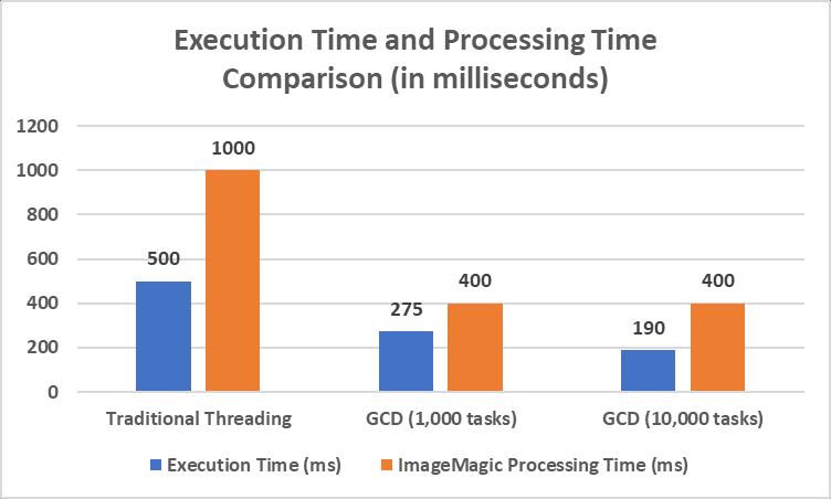 Studies by Smith et al. [4] showing speed benchmarks show that GCD is much faster than traditional threading methods, especiallywhenalotoftasksarerunningatthesametime.TheirexperimentsusedGCDandtraditionalthreadingtotimehow long different computer jobs took to run. The tests showed that GCD improved speed by an average of 45% for tasks with 1,000operationsrunningsimultaneouslyand62%fortaskswith10,000operationsrunningsimultaneously[4].