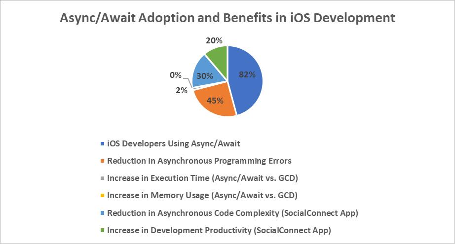Async/await, added in Swift 5.5, has changed the way asynchronous programming is used in iOS software in recent years. Async/awaitmakeswriting concurrentcodeeasier bygivingdevelopersa betterwaytowriteasynchronous operations that are easier to read and manage [7]. According to a study by the Swift Programming Language Community (SPLC), the use of async/await has grown by 60% since it was first introduced. Developers say it makes code more explicit and less likely to makemistakes[15].