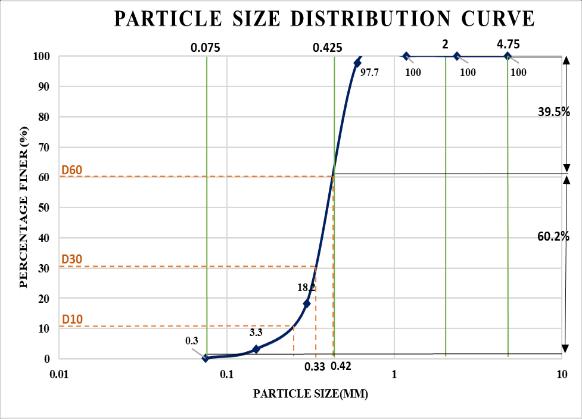 Thesoilusedinthisstudywasexcavated1.5mbelowthe ground level. The soil was collected from Menamkulam, Trivandrum.Thepropertiesofthesoilaresummarizedin Table 1. The values of coefficient of curvature and uniformitycoefficientwereobtainedfromtheparticlesize distribution curve (Fig.1). After testing the soil, it was found that the collected sample was Poorly Graded Sand (SP)accordingtoISSpecifications.