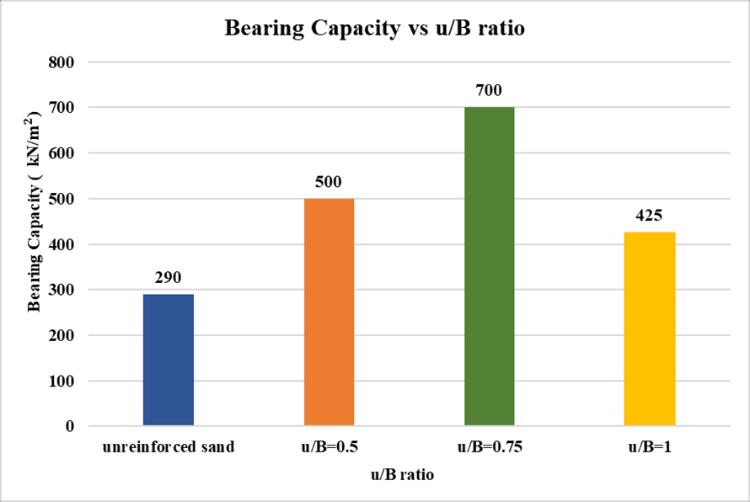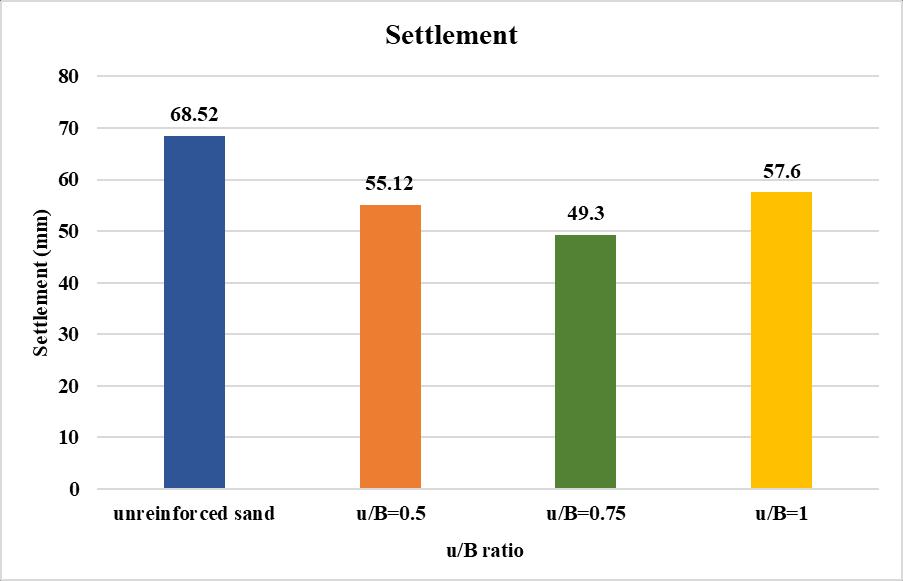 Fig7and8showsthecomparisonofbearingcapacityand settlementfordifferentu/Bratiosrespectively.Theresults show a considerable reduction in bearing capacity and increaseinsettlementwhenCGTwasplacedatu/B=1.The studyalsoshowstheimprovedeffectinstrengthofsoilby utilizingreinforcementindifferentformandshape.