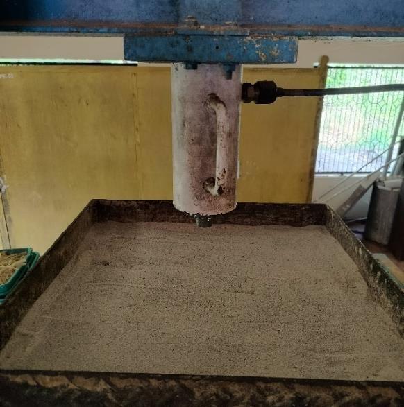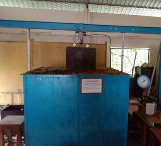 Theexperimentalsetupforthisresearchincludesaloading frame, a test tank, a hydraulic jack, and additional instrumentsforloadandsettlementmeasurement(Fig2). In this study, a test tank measuring 50x50x50 cm and a plateofsize20x20cmwereutilized,withtheloadingplate having a thickness of 10mm. Manual application of load wascarriedout,withobservationsofsettlementrecorded for each load increment, and subsequent settlement calculationswereperformed.Furthermore,aprovingring and deflection gauges were arranged to apply load and determinesettlement.