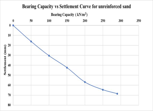 The bearing capacity settlement graph of sand without reinforcement is shown in Fig 5. The maximum bearing capacity of sand was found as 290 kN/m2 and the maximumsettlementwasobtainedas68.52mm.