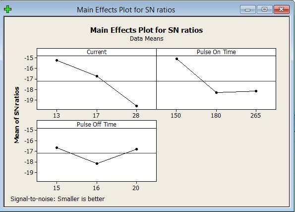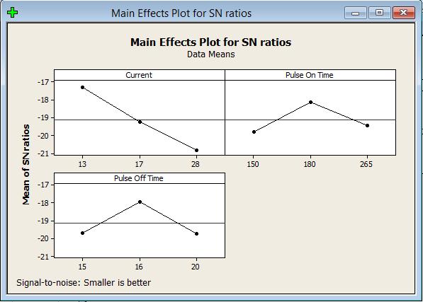 This figure shows the principal plot for MRR at 3 mm thickness for current, pulse on time, and pulse off time. ExperimentaldataindicatesthehighestMRRat28A,180��s pulseontime,and15��spulseofftime.ThelowestMRRwas observedat13A,150��spulseontime,and15��spulseoff time.
