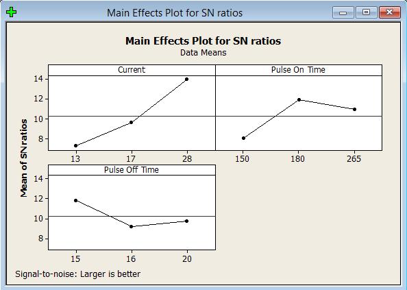 This figure shows the principal plot for MRR at 3 mm thicknessforcurrent,pulseontime,andpulseofftime.The largestMRRwasseenat28Acurrent,150��spulseontime, and 20 ��s pulse off time in experiments. The lowest MRR wasobservedat13A,150��spulseontime,and15��spulse offtime.
