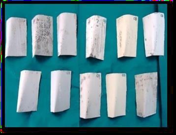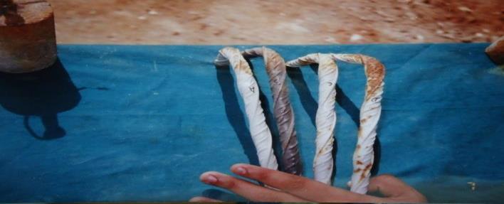 After pretreatment in triplicate, immediately deformed cold twisted bars of 8 mm, 10 mm, 12 mm, and 16 mm in diameterwerecoated.Thesebarsweresubjectedtoabendingcheckwithamandrel.Thepinischanged toregularwithclean plastic sheets at the guide so that when bending operation no damage was modified induced to the coating through the manner of approach of the mandrel. Immediately the coated bars are bent at 450 and 900 from its precise immediate line. Duringandafterthebendingoperation,thecoveredgroundonthemetallicbarismodifiedintodecidingforthedevelopment ofcracks,fissures,disbandment,straining,domination,discolorationetc.Fig.6.indicatesthebentrods.Observedeffects have beenreportedforselectedcoatingsinTable4.