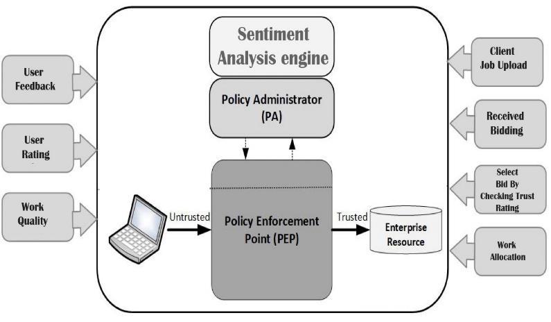 The Trust Management Service Platform system architecture comprises several interconnected components designed to facilitate trust, integrity, and transparency in freelance collaborations. Users, including both clients and freelancers, engage in a feedback loop where they provide and receive feedback on their collaboration experiences. This feedback, which may include ratings, reviews, and comments, is crucial for assessing the quality of work and professionalism of each party. User ratings, derived from this feedback, serve as indicators of reputation and trustworthiness, aiding other users in making informed decisions when selecting collaborators. The system also incorporates mechanisms for evaluating work quality, considering factors such as accuracy, timeliness, and adherence to project requirements. A sentiment analysis engine further enhancesthisevaluationprocessbyextractingsentiments expressed in text-based feedback, categorizing them as positive, negative, or neutral. The Policy Administrator (PA)assumesapivotalroleindefiningandmanagingtrust and integrity policies governing user interactions. These policies encompass rules and guidelines for behavior, feedback,ratings,anddisputeresolution,ensuringfairand ethicalconductamongusers.ThePolicyEnforcementPoint (PEP) complements the PA by enforcing these policies, monitoring user interactions, identifying violations, and initiating appropriate actions such as warnings, account suspensions, or dispute resolutions. The platform's Enterprise Resource provides the necessary computing, storage, and networking infrastructure to ensure scalability, reliability, and performance, supporting the platform's operations and accommodating increasing user demands.