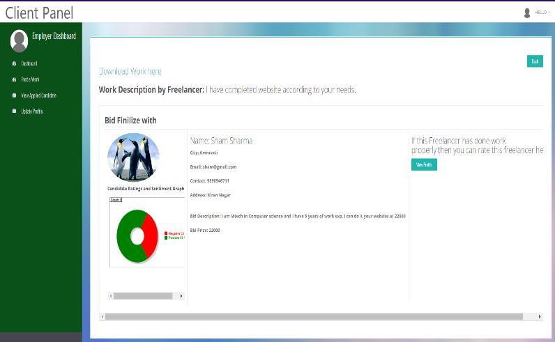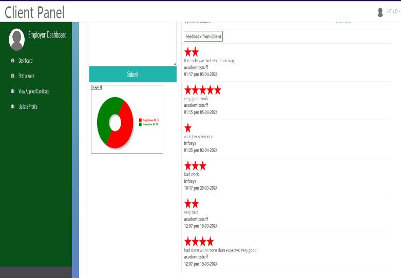3. Integration of Feedback and Sentiment Analysis: The integration of feedback and sentiment analysis into freelancerprofilesenhancestransparencyandtrustwithin the platform. By analysing the sentiment expressed in client reviews, the platform can provide clients with deeper insights into freelancer trustworthiness and professionalism. This integrated approach ensures that clients have access to comprehensive information when evaluatingfreelancersfortheirprojects.