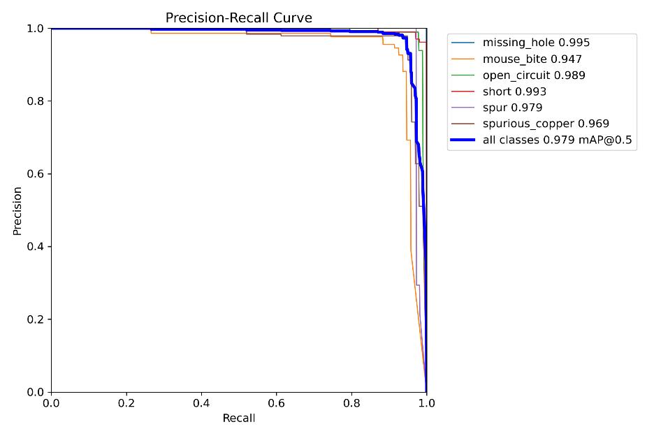 To determine the weights, the PCB-YOLO model was subjectedtoseveraltrainingcyclesonthetrainingset.The testset'simageswereusedtotestthemodelusingtheideal weightsthatweredeterminedduringthetrainingphase.The experimentalfindingsshowthatthemeanaverageprecision (mAP) of 0.995 for the detection of missing holes is quite good. The unique characteristics and fewer diversified shapesassociatedwithmissingholesarethereasonforthis performance.Similartospuriouscopper,opencircuits,and shorts have high mAP values because of their decreased vulnerability to other flaws and background interference. Due to their physical similarities, spur and mouse bite defectscanbedifficulttoidentifyfromoneanother,which couldresultinmisidentificationsoncetheregionaldensity reaches a certain point. In spite of this intricacy, the PCBYOLO-v8 model is able to detect all six flaws with a mean averageprecisionof0.979.