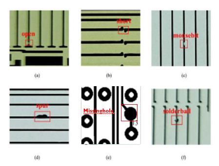 Printingboards,arrangingcomponents,andsolderingareall includedinPCBproduction.Duringthesephases,thereisa possibilityofseveralpotentialflaws,suchasincorrectsolder joins, short circuits, empty or open circuits, and excess solder (which appears as overflowing solder on solder points).Theseflawscouldjeopardizetheboard'sstabilityor perhaps cause the board to break entirely. Thus, it is imperative to implement a highly effective and precise automatic detection module for the purpose of examining variousflawsduringthePCBmanufacturingprocess.Figure 2illustratesexamplesofsurfacedefectsinPCBs.