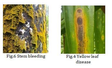 4. YellowLeafDisease:Thisdiseaseischaracterized byLeaftips of2 or3outermostwhorlleavesturn yellow.Brownnecrotic streaks run parallel to the spreading leaf veins. The yellow color extends to themiddle of the leaf blade. The tipsoftheleaves turn yellow and dry. At the advanced stage, all leaves turn yellow. The yellow color of the leaves is visible from October to December. Finally, the foliage falls, leavingthe tree trunk bare. The ends oftherootsturnblackandgraduallyrot