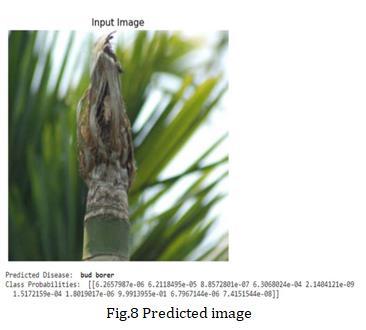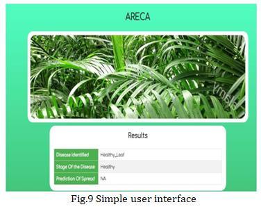 A thorough test is conducted on our own dataset to evaluate the system's capability. The 1200 photos that were gathered for the suggested method included several Arecanutplantdiseases.FollowingRESNETmodeltraining, the observed accuracy was 97.5 percent. Images and location areinputs used to identify diseases and choose suitable measures.The model identifies the disease and highlights the need for action with regard to Areca nut plants.TheoutputofthemodelinKaggleisshownbelowFig 8 RESNET model-Kaggle. The model will determine the disease's name and the likelihood ofeach possibility after receivinganimage.