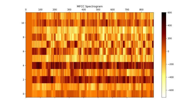 Mel-frequencycepstralcoefficients(MFCC)spectrogramisa graphical depiction of a sound signal's short-term power spectrum.Thecepstralcoefficientsareshownbythey-axis, which runs from -6 to 10, and the time frames are represented by the x-axis, which runs from 0 to 800. Differentfrequenciesandtheirintensitiesarerepresented bythespectrogram'schangingcolours,wheredarkershades denote lower energy levels and brighter colours indicate greaterenergylevels.Acolourbarshownontherightside representstheenergy.
