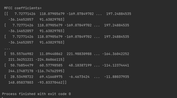 Thisimageshows13MFCCcoefficientsfromanaudiofile, witheachsetofcoefficientsenclosedwithinsquarebrackets.