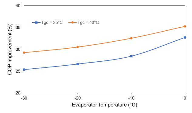 The percentage increase in cycle COP that results from replacingtheexpanderwithanexpansionvalveandvarying the evaporator temperature forfixed gas cooler temperaturesisdisplayedinFigure12.Inthisalso,thegas cooler and intermediate pressures are concurrently optimised.Theintermediatepressurevariesfrom2-8MPa, whilethegascoolerpressureisvariedbetween6-12MPa. Theevaporatortemperaturerangesbetween-30°Cto0°C, thegascoolertemperatureisassumedtobe35°Cand40°C. WithreferencetoFigure12,itcanbeobservedthatinboth cycles,thepercentageincreaseinCOPriseswithanincrease in evaporator temperature. Additionally, the analysis suggeststhatasthegascooleroutlettemperaturerises,the percentageimprovementinCOPincreasesaswell.