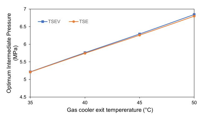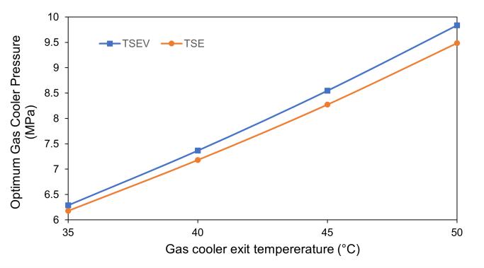 ThevariationoftheoptimumgascoolerpressurefortheTSE and TSEV cycle, where the intermediate pressure is maximized,withchangesingascoolerexittemperatureis depicted in Figure 7. The gas cooler pressure range is observed to be between 6 - 10 MPa. The gas cooler exit temperaturerangesbetween35-50°Candtheevaporator temperatureisassumedtobe0°C.WithreferencetoFigure