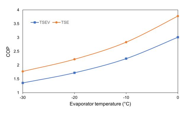 For both TSE and TSEV cycles, as the evaporator temperature increases, the COP of both cycles increases.