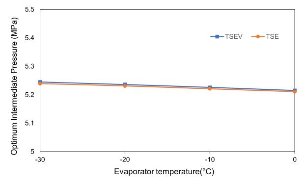 Thevariationoftheoptimumintermediatepressurewiththe temperature in evaporator for both TSE and TSEV cycle, whenthegascoolerpressureisvaried,isdepictedinFigure 9.Theoptimumintermediatepressureisobservedat5.25 MPa when the evaporator temperature ranges between30°Cto0°C,thegascoolerexit,andintercoolertemperature is assumed to be 35°C. With reference to Figure 9, it is evidentthatbothcyclesexhibitasimilarbehaviourwhereby the optimum intermediate pressure reduces as the evaporatortemperatureincreases.Thegraphindicatesthat, incomparisontotwo-stagetranscriticalcyclewithexpander, thevaluesofoptimumintermediatepressureachievedfor cyclehavingexpansionvalveareslightlyhigher.
